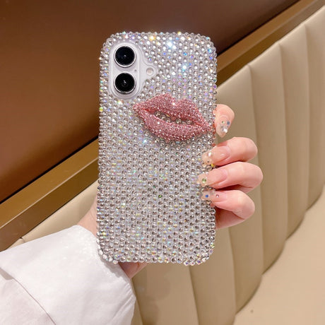 iPhone 16 Hybrid Deksel med Rhinestone og 3D Kyssmunn - Rosa