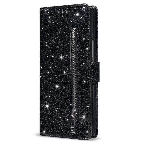 Samsung Galaxy Z Fold7 Glitter Flip Deksel m. Lommebok & Stropp - Svart