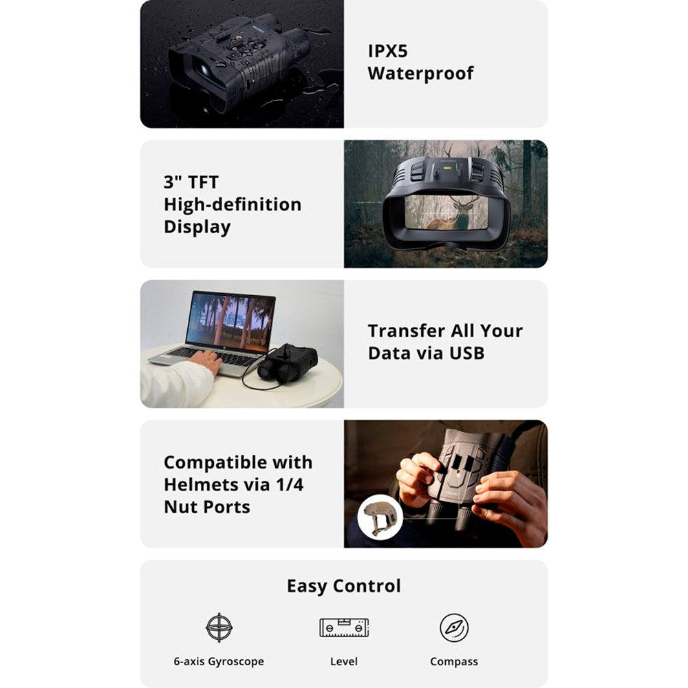 Til tross for sine avanserte funksjoner er denne nattkikkerten lett og bærbar med en vekt på under 500 gram, noe som gjør den enkel å ta med i en bag eller feste til hjelm, stativ eller stropp. Det robuste IPX5 vanntette designet sikrer pålitelig bruk under alle værforhold.