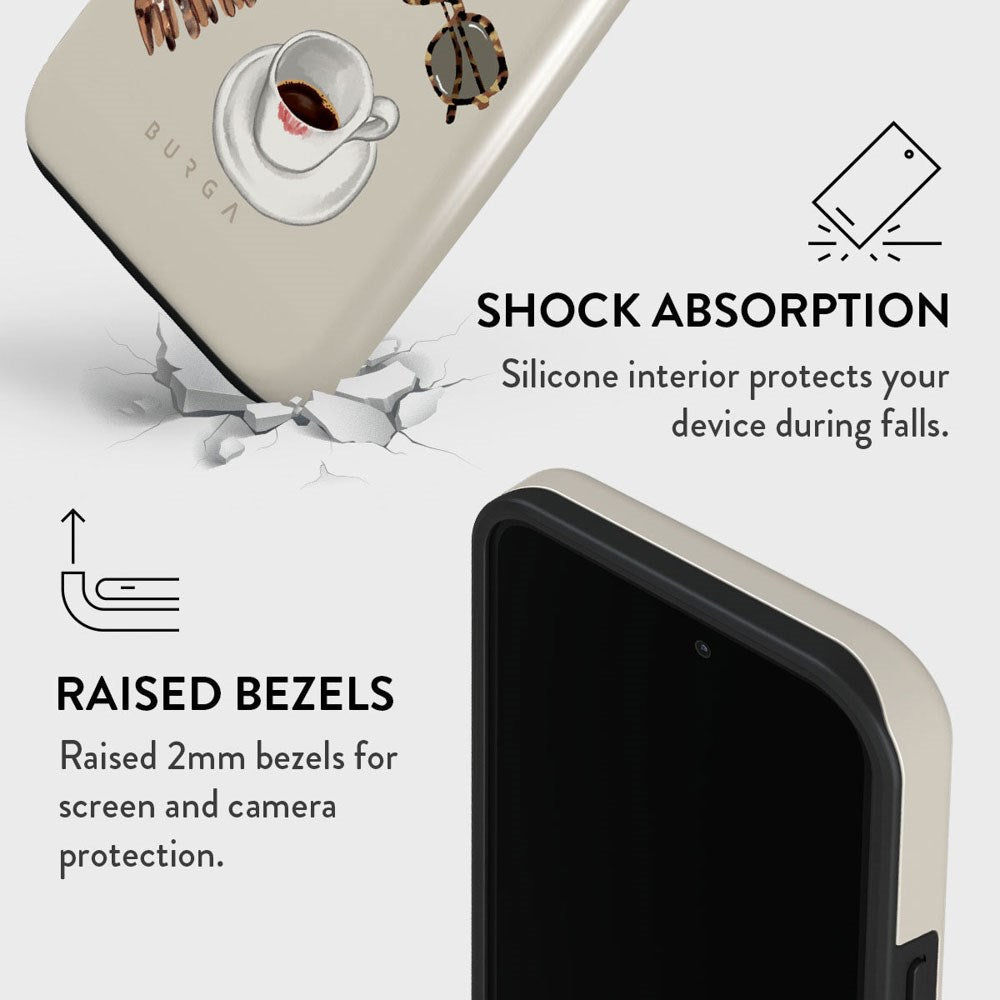 I kombinasjon med dekselets eksepsjonelle visuelle design, har Burga gitt dekselet en unik beskyttende funksjon. Dekselet er to-delt, hvor den ene delen består av et unikt designet skall av hard plast, og innsiden er produsert i ytterst beskyttende støtabsorberende silikon.