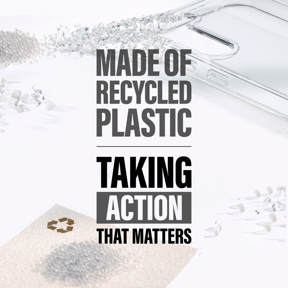 Dette iPhone 16 dekselet er laget av resirkulert plast og har åpninger for høyttaleren, kameraet og blitzen, samt mulighet for å koble til laderen mens dekselet er på.