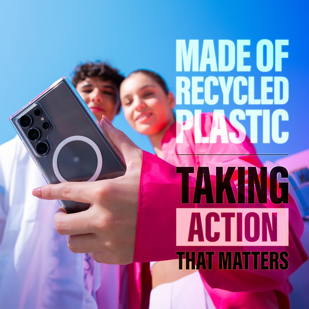 Det moderne og stilrene dekselet er laget av 100% resirkulerbar plast og har 1 års anti-gulningsgaranti, slik at det gjennomsiktige utseendet til Samsung Galaxy S25 holder seg klart.