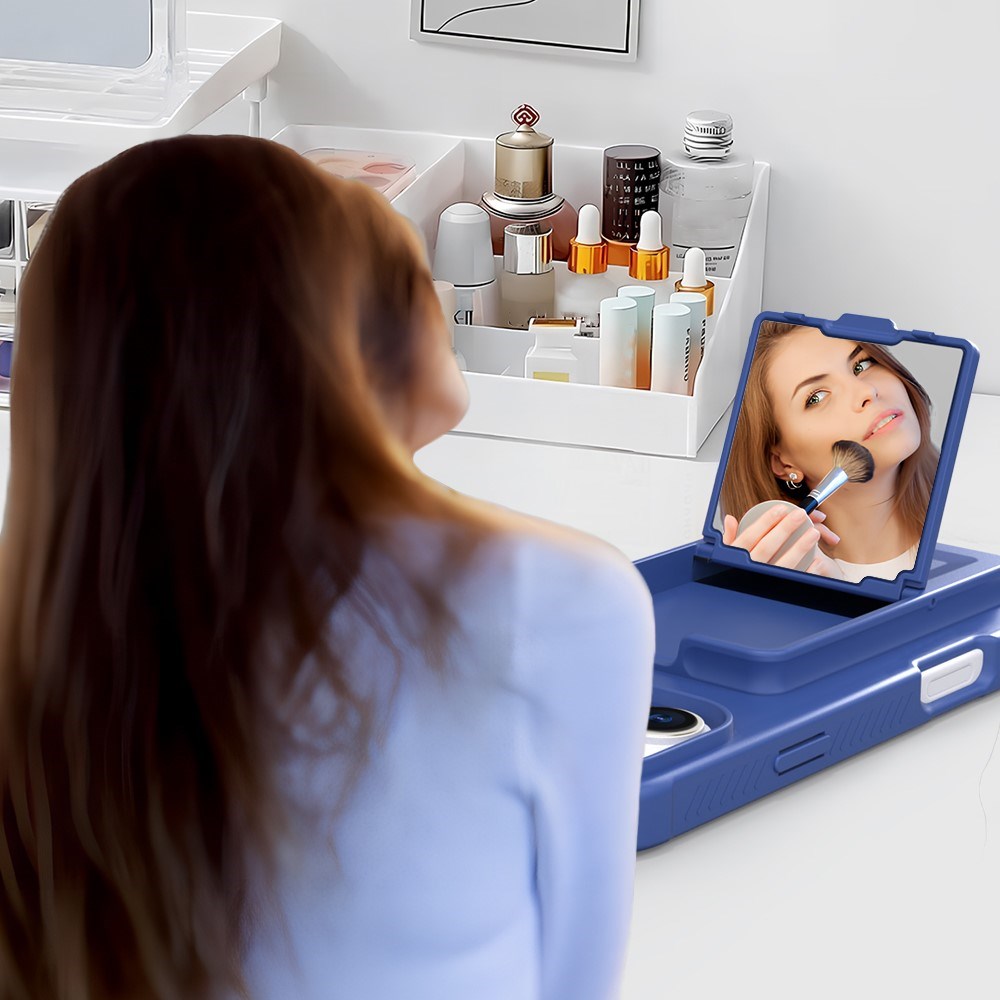 På innsiden av kortholderen sitter det også et lite speil som gjør det enkelt å raskt sjekke frisyren eller om du har noe mellom tennene. Når speilet er foldet ut, kan det også brukes som et støttestativ, slik at telefonen kan stå alene – perfekt for f.eks. å se filmer.