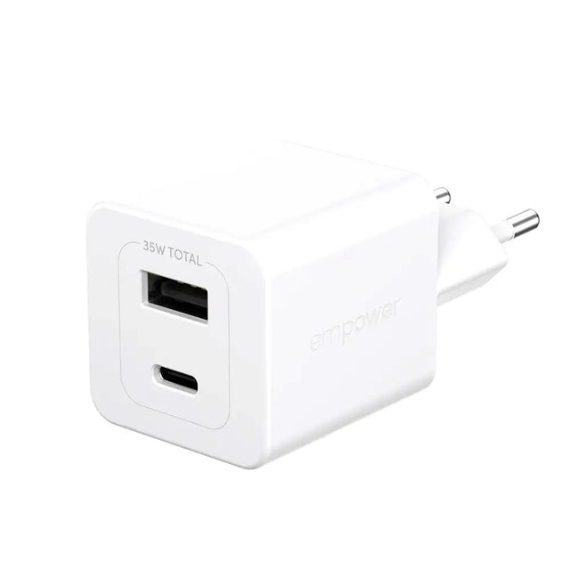 Denne veggladeren fra empower by PanzerGlass er designet for effektiv lading av enhetene dine. Med en samlet effekt på 35W og både en USB-C- og en USB-A-port, kan den lade flere enheter samtidig. Laderen støtter hurtiglading, noe som gjør den til en praktisk løsning for å holde enhetene dine med strøm. Den er utstyrt med en EU-plugg for bruk i standard stikkontakter.
