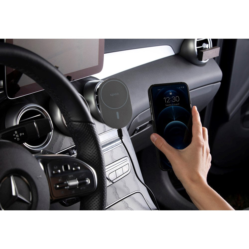 Her får du en praktisk og smart Epico Magnetisk Mobilholder med 15W trådløs lading til bilen, som er MagSafe-kompatibel. Holderen er enkel å montere og festes til bilens ventilasjonsuttak. På denne måten sikrer du at mobilen din og holderen forblir på plass, selv under lange turer med mange ujevnheter. Mobilholder m. trådløs lading kan roteres 360° slik at den alltid sitter i den vinkelen du ønsker. Den er perfekt å ha i bilen til for eksempel handsfreesamtaler, GPS og når du mangler strøm.