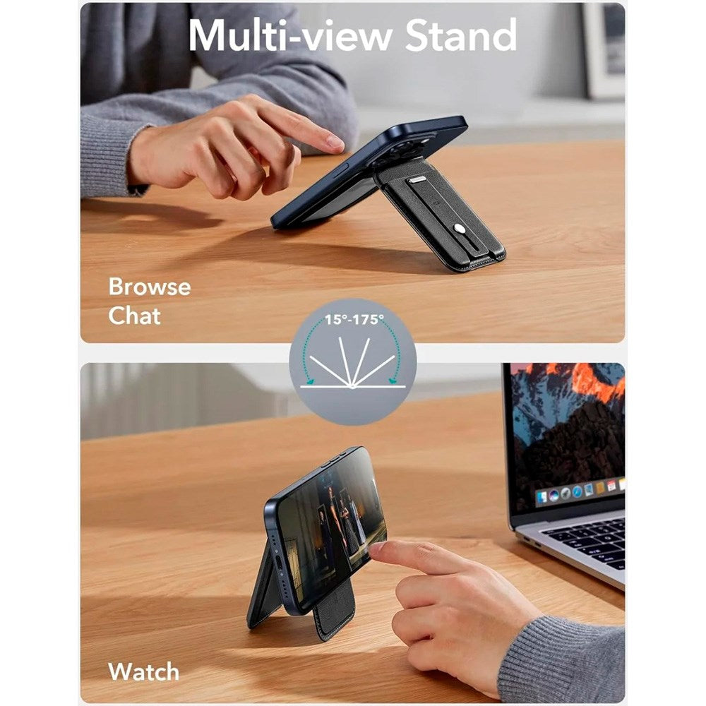 Den smarte fingerremmen gir ekstra grep, så du kan enkelt holde mobilen uten risiko for at den sklir ut av hånden din. GripWallet fungerer også som et praktisk stativ – du kan bruke den både i horisontal og vertikal posisjon, og justere synsvinkelen mellom 15° og 175° for en komfortabel opplevelse.