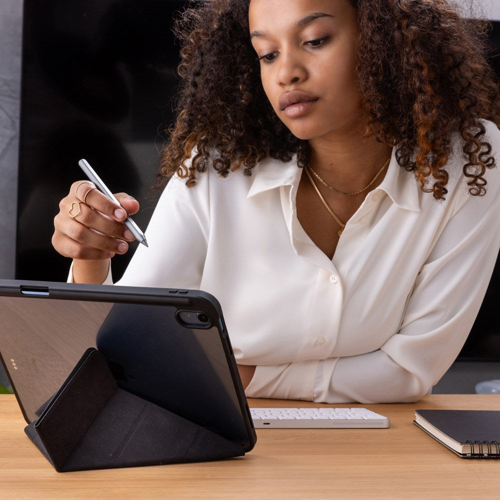 Med sitt smarte, multifunksjonelle design kan dekselet brettes ut i en tri-fold-stativ, som gir deg optimal synsvinkel, enten du arbeider eller slapper av med underholdning. Det origami-inspirerte designet er ikke bare stilig, det er også praktisk og ergonomisk. Bakdelen av dekselet er konstruert av støtabsorberende, fleksibel plastikk som effektivt beskytter din iPad mot utilsiktede støt og fall. Den gjennomsiktige bakdelen lar deg vise frem din iPads originale design, samtidig som den forblir beskyttet mot riper og skrammer.