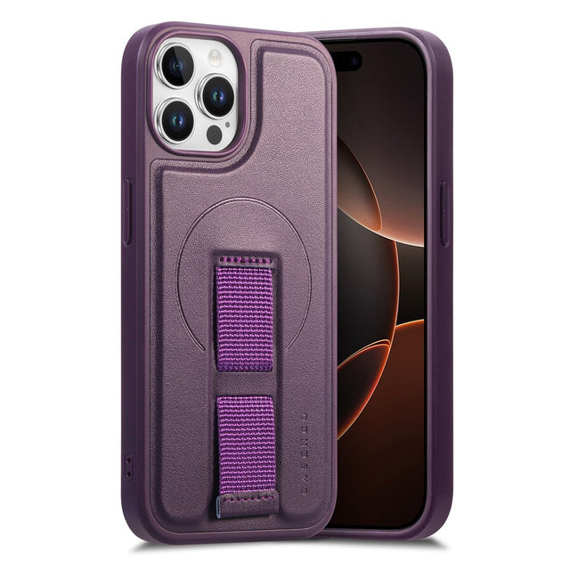 iPhone 12 / 12 Pro Hard Plast Deksel m. Kunstskinn Bakside & Fingerrem - MagSafe Kompatibel - Lilla