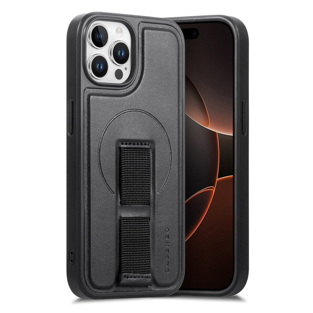 iPhone 12 / 12 Pro Hard Plast Deksel m. Kunstskinn Bakside & Fingerrem - MagSafe Kompatibel - Svart