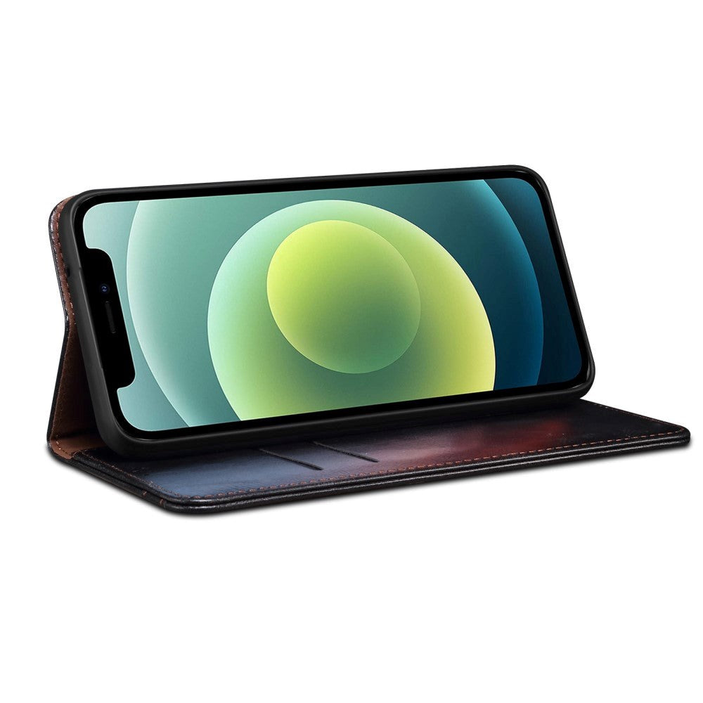 Dette omslaget med veske er designet med svart imitert skinn på utsiden og innsiden. Inne i omslaget er det to lommer for kredittkort eller. lignende og en stor lomme for sedler. I tillegg er det også et fleksibelt plastdeksel, som er støtdempende og dermed gir enda mer beskyttelse for din iPhone 13.