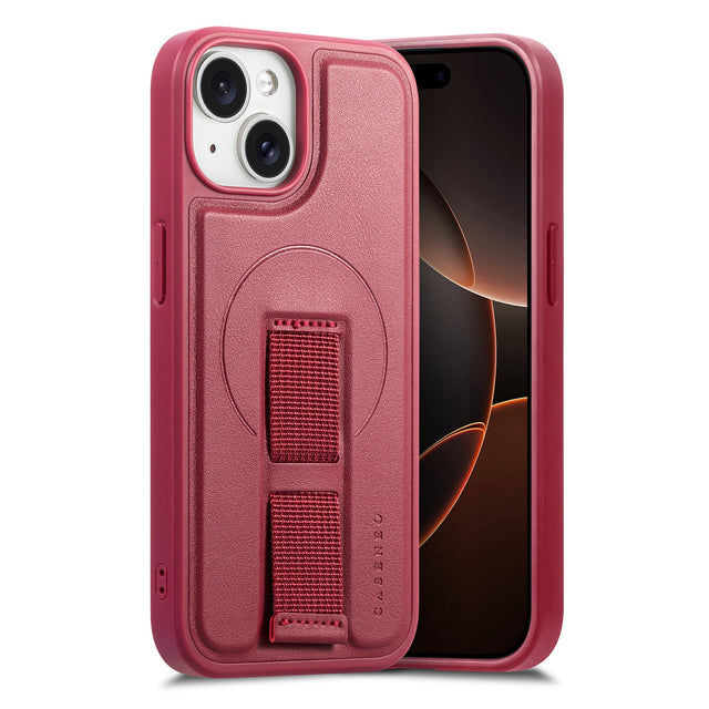 iPhone 14 / 13 Hard Plast Deksel m. Kunstskinn Bakside & Fingerrem - MagSafe Kompatibel - Rød