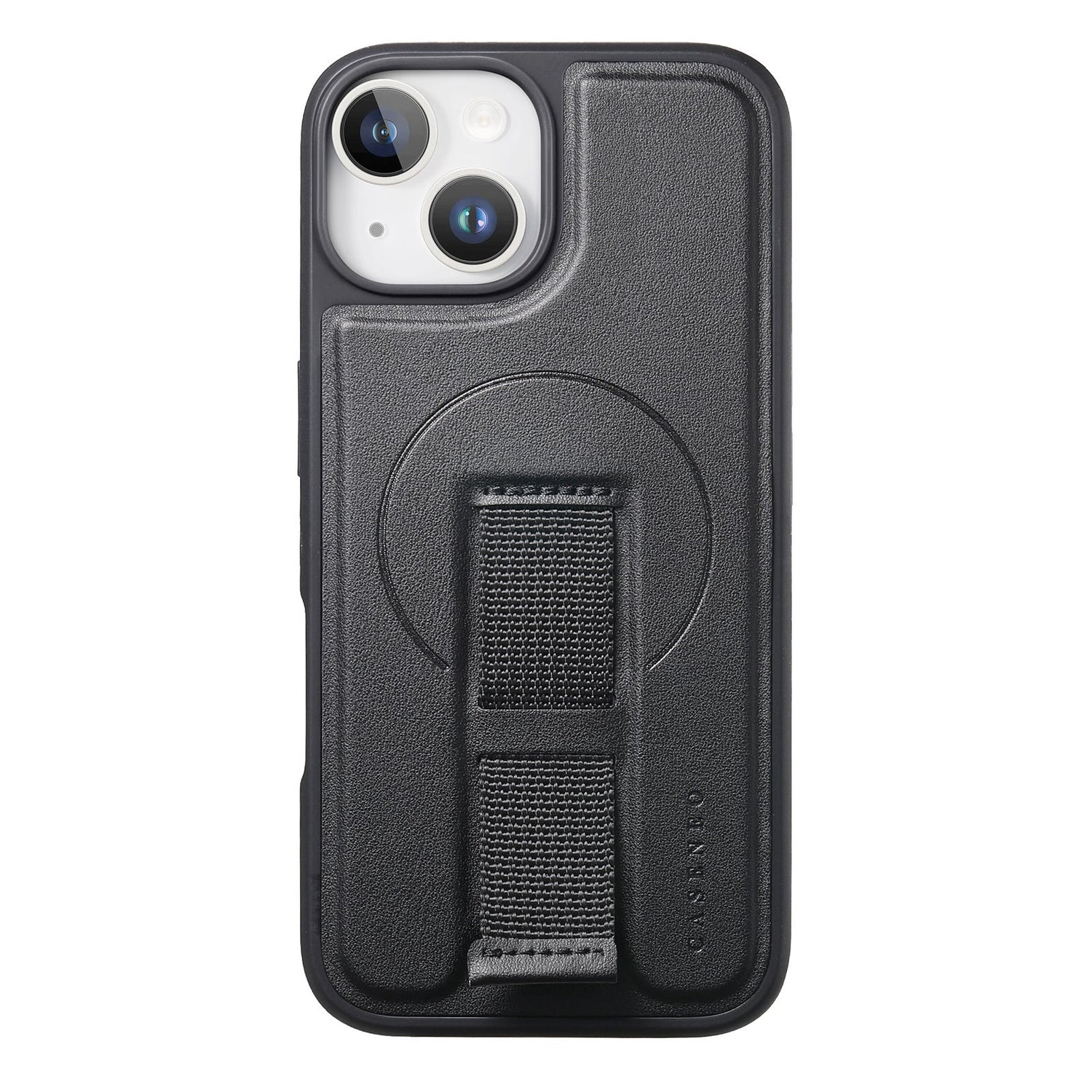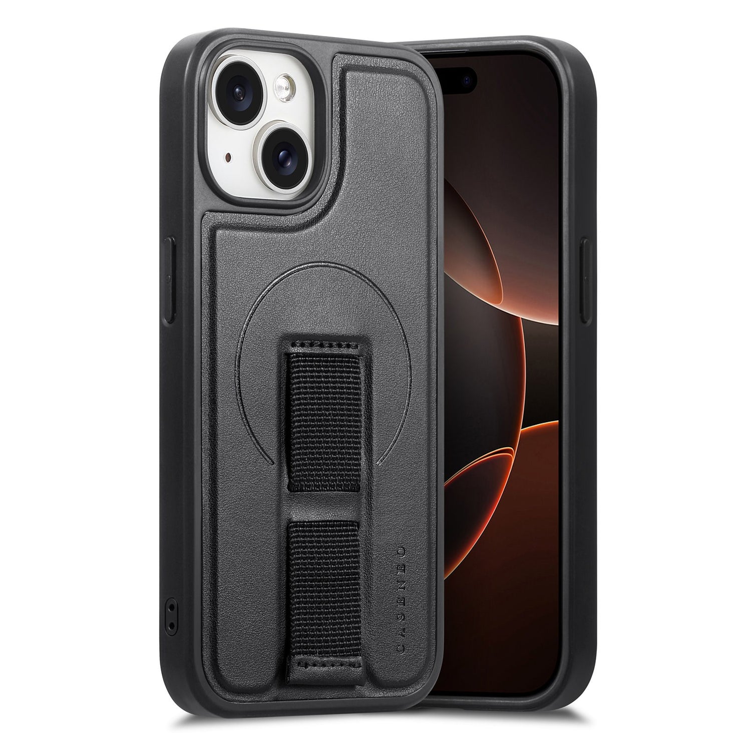 iPhone 14 / 13 Hard Plast Deksel m. Kunstskinn Bakside & Fingerrem - MagSafe Kompatibel - Svart