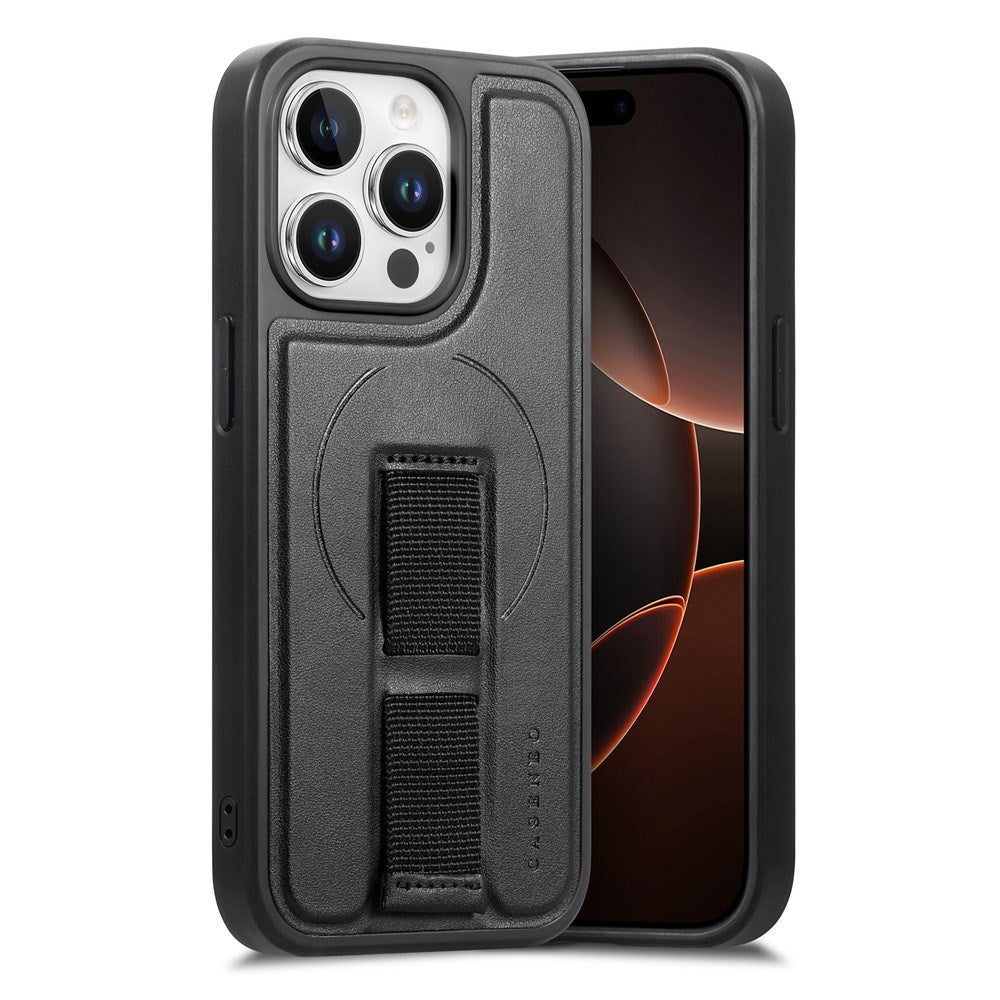 iPhone 14 Pro Hard Plast Deksel m. Kunstskinn Bakside & Fingerrem - MagSafe Kompatibel - Svart