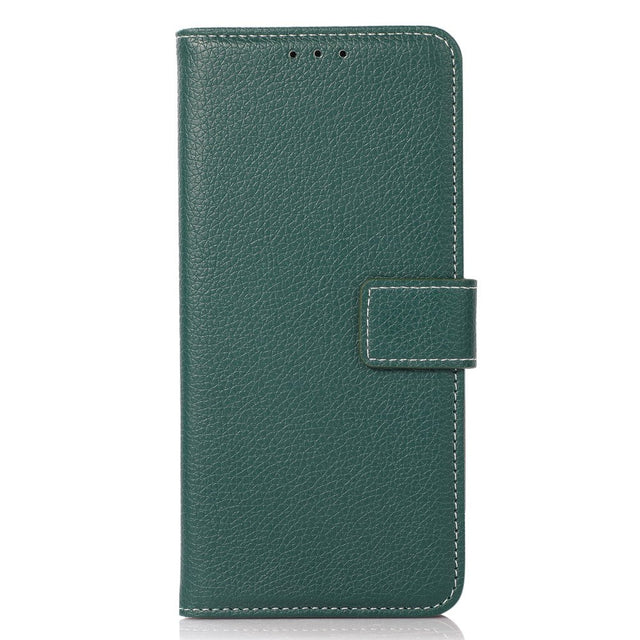 iPhone 15 Pro Litchi Leather Flip Deksel med Hvite Sømmer og Lommebok - Grønn