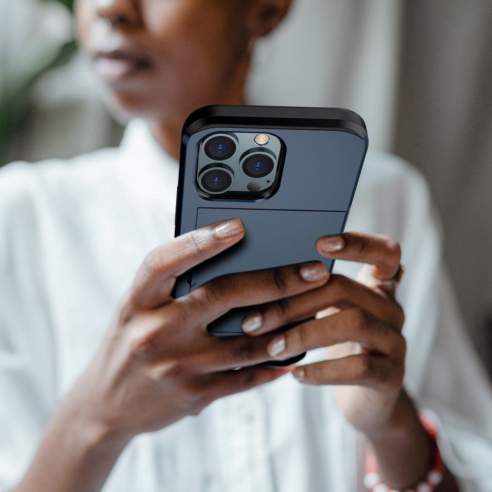 Et deksel til iPhone 15 Pro Max, som er ideelt for folk som bruker telefonen under utsatte forhold. Den er ekstra sterk, og samtidig er det mulig å lagre kredittkort på baksiden av dekselet.