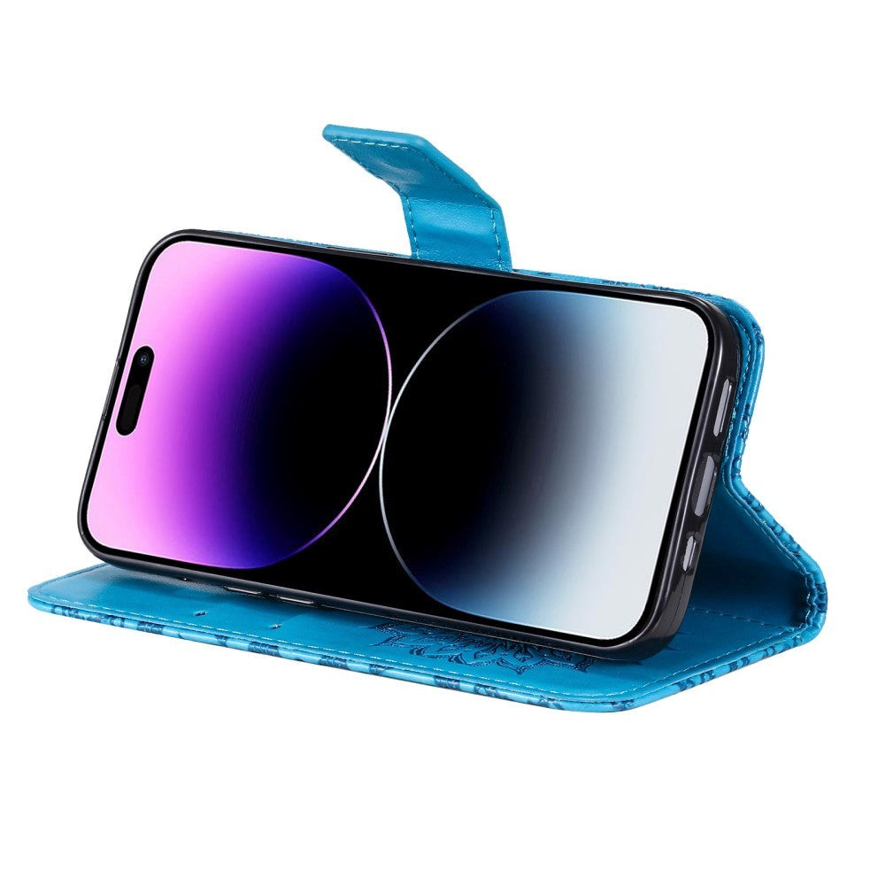 iPhone 15 Pro Max Skinn Deksel med Lommebok og Stropp - Mandala Blomst - Blå