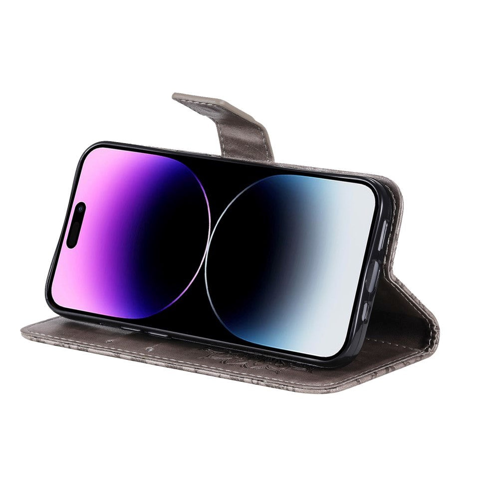 iPhone 15 Pro Max Skinn Deksel med Lommebok og Stropp - Mandala Blomst - Grå