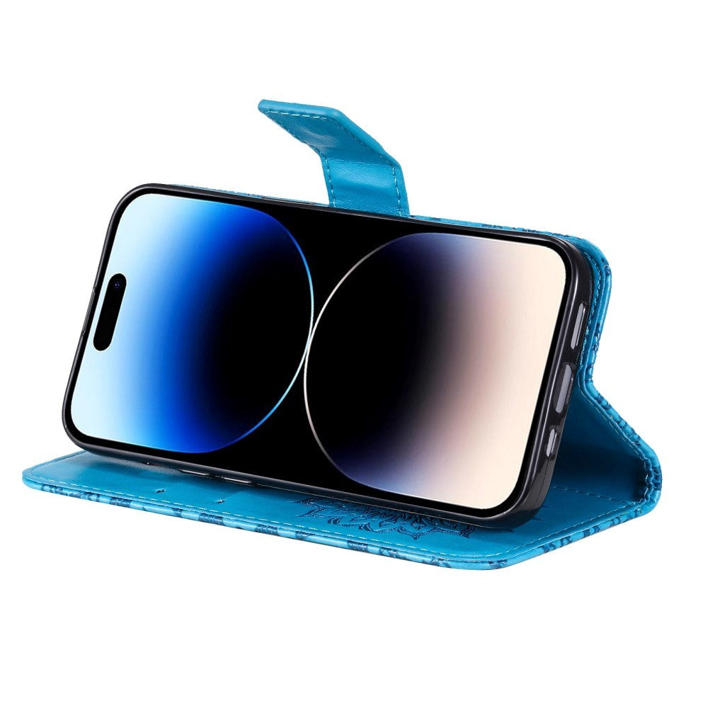 iPhone 15 Pro Skinn Deksel med Lommebok og Stropp - Mandala Blomst - Blå