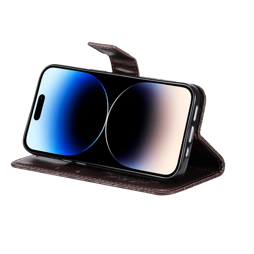 iPhone 15 Pro Skinn Deksel med Lommebok og Stropp - Mandala Blomst - Mørkebrun