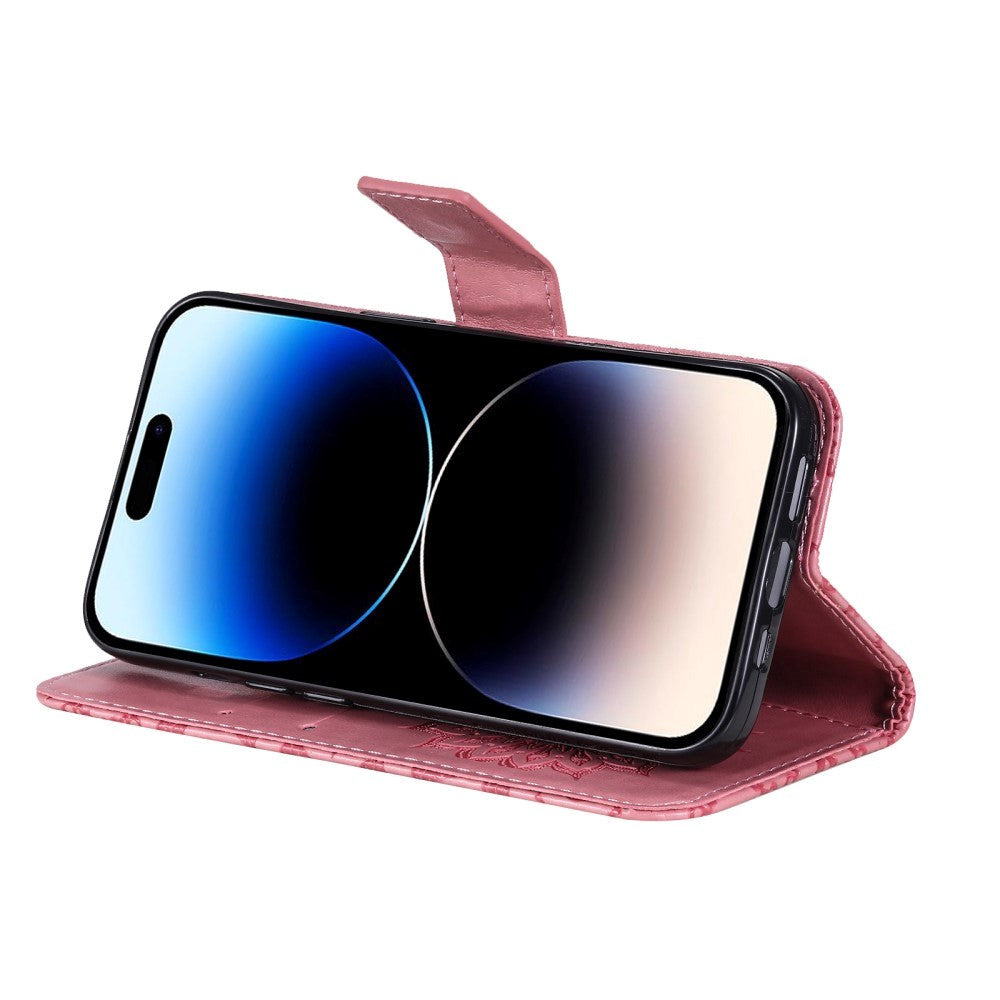 Et iPhone 15 Pro deksel med lommebok, som har et preg av et fint mandalamønster, som gir et personlig og elegant utseende, samtidig som det gir god beskyttelse.