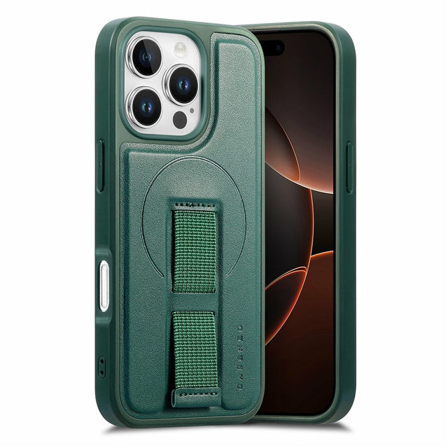iPhone 16 Pro Hard Plast Deksel m. Kunstskinn Bakside & Fingerrem - MagSafe Kompatibel - Grønn