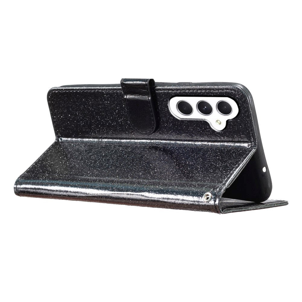 Samsung Galaxy A55 Flip Deksel med Lommebok og Stropp - Glitter - Svart