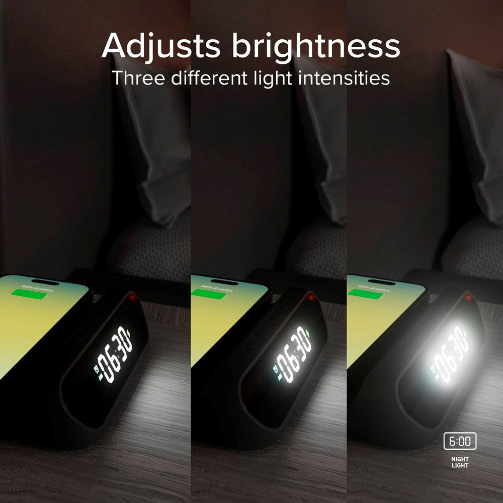 Vekkerklokken har et stort digitalt display med 3 justerbare lysstyrker, slik at du kan tilpasse det etter dine preferanser - uten å forstyrre nattesøvnen. Du kan velge mellom 12- eller 24-timers visning og bruke snooze-funksjonen med 5 minutters intervaller for en rolig og behagelig oppvåkning.