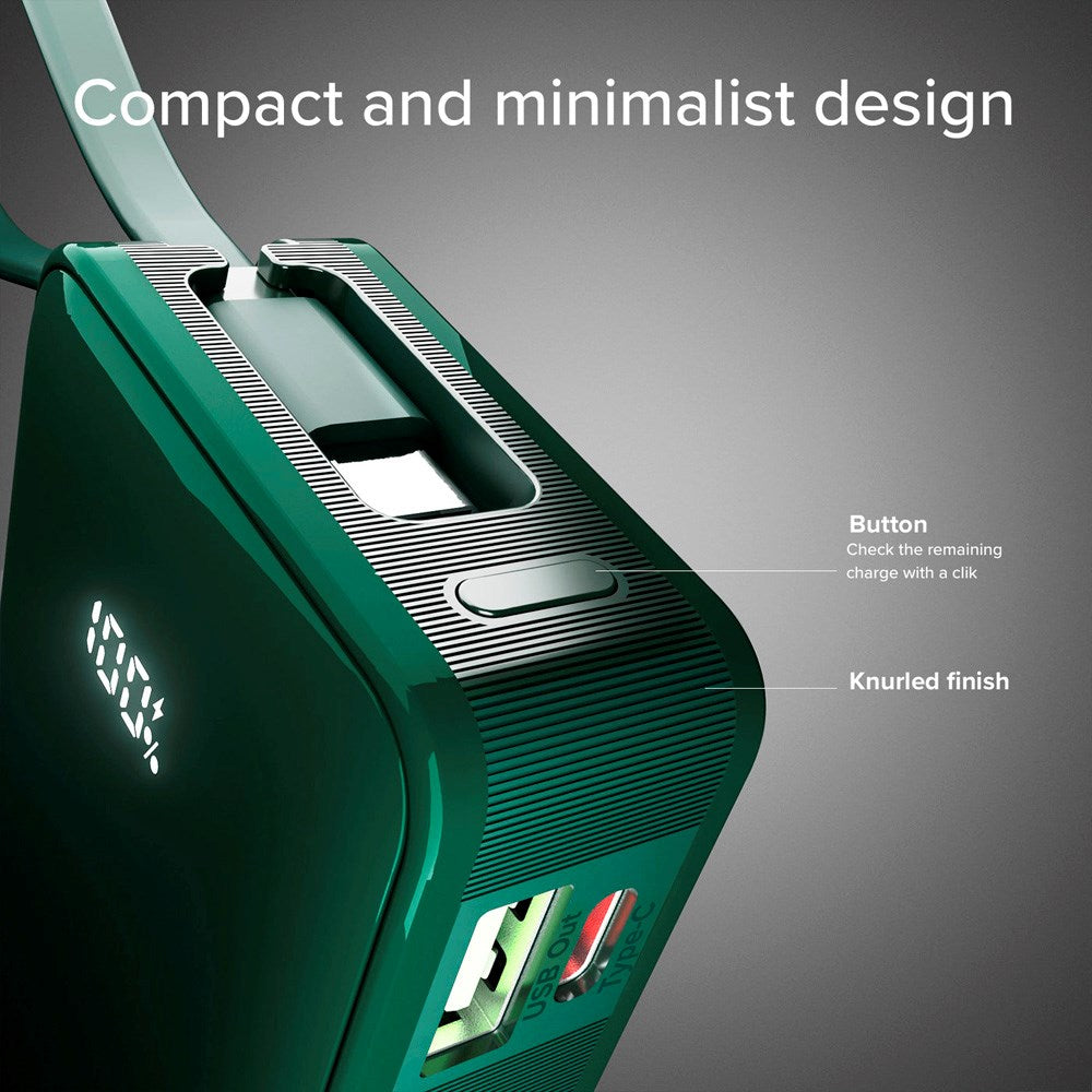 Med et enkelt trykk på på/av-knappen aktiveres det digitale LCD-displayet, som viser nøyaktig hvor mye strøm som er igjen. Når batteriet er lavt, kan du enkelt lade opp PowerBanken via det innebygde kabelet eller USB-C-porten.