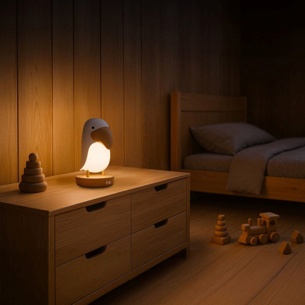 Tukan-nattlampen fra T’nB er utviklet for å skape ro og trygghet gjennom en behagelig kombinasjon av mykt lys og avslappende lyder, som gjør det lettere å slappe av og sovne – for både barn og voksne. Lyset kan justeres etter behov, fra et diskret skjær til et klarere lys, og med den spesielle pustefunksjonen pulserer lyset sakte og gir rommet en rolig og beroligende stemning.