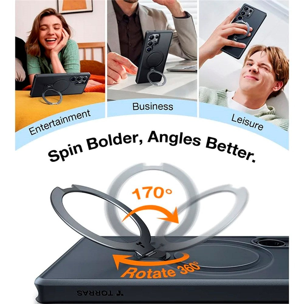 Den 360° roterende kickstand-ringen gir deg muligheten til å nyte håndfri visning, mens de innebygde 18N-magnetene sikrer MagSafe-kompatibilitet, slik at du enkelt kan lade og bruke tilbehør uten å fjerne dekselet.