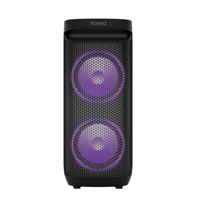 Denne 10" Bluetooth-høyttaleren fra Xceed lar deg starte en fest – når som helst, hvor som helst. Det bærbare designet med hjul under og bærehåndtak på toppen gjør det enkelt å ta høyttaleren med fra sted til sted, slik at musikk og lys alltid kan være med.