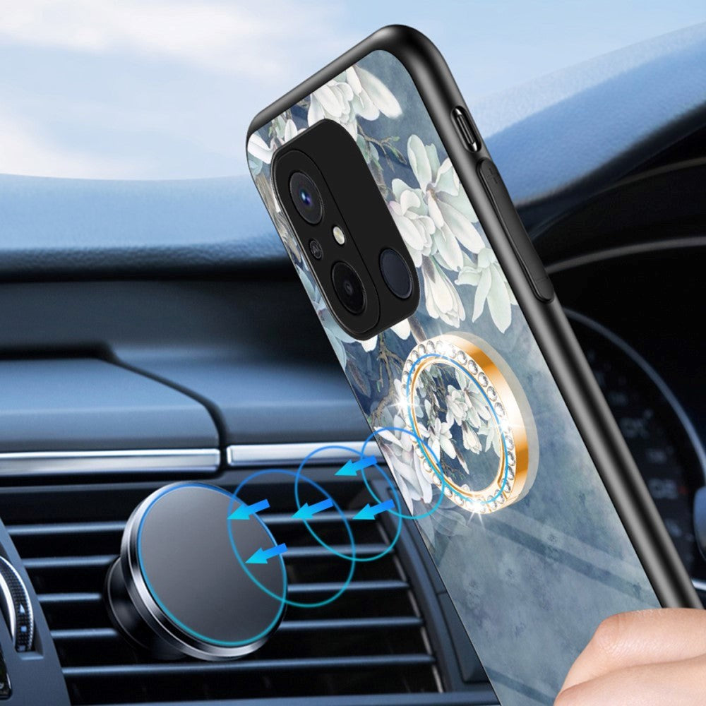 Xiaomi Redmi 12C Fleksibel Plastik Deksel m. Glassbakside & Magnetisk Stativ / Fingerring - Svart m. Blomster